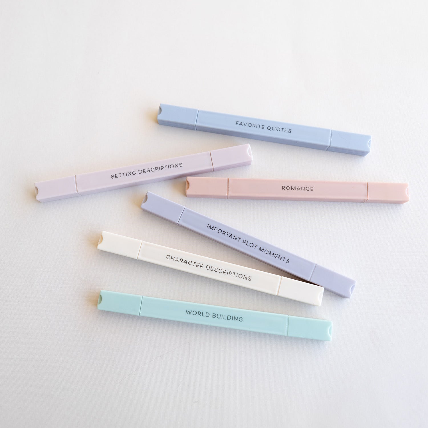 In six beautiful pastel shades, this set of highlighters is perfect for highlighting as you read! Each highlighter is designated for a specific purpose which is written on the corresponding color.